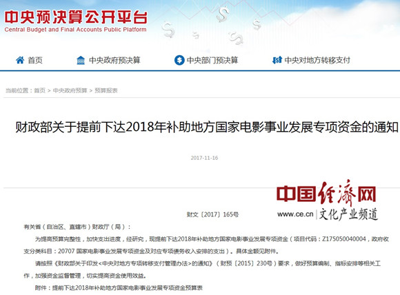 財政部關(guān)于提前下達(dá)2018年補助地方國家電影事業(yè)發(fā)展專項資金的通知