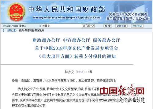 通知說明,為支持文化產業發展,推動社會主義文化繁榮興盛,根據《深化財稅體制改革總體方案》《國務院關于改革和完善中央轉移支付制度的意見》《2018年文化體制改革和發展工作要點》等有關要求,財政部、中宣部和商務部聯合管理2018年文化產業發展專項資金(重大項目方面,以下簡稱專項資金)轉移支付項目申報工作。