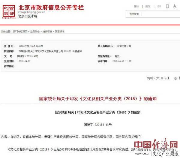 國家統計局關于印發《文化及相關產業分類(2018)》的通知