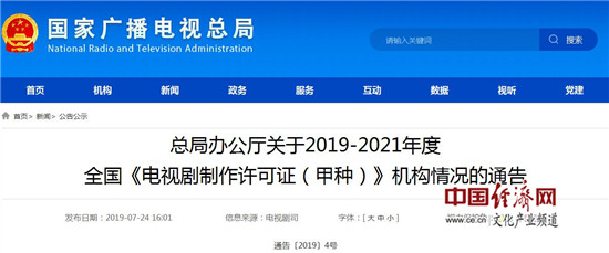 經(jīng)濟(jì)日報-中國經(jīng)濟(jì)網(wǎng)北京7月30日訊 日前,廣電總局公布2019-2021年度《電視劇制作許可證(甲種)》機(jī)構(gòu)名單。中國電視劇制作中心有限公司、中國電影股份有限公司、中國國際電視總公司等73家機(jī)構(gòu)入選。