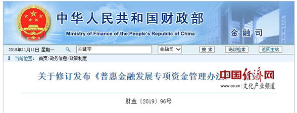 經濟日報-中國經濟網北京11月26日訊 日前,財政部修訂發布《普惠金融發展專項資金管理辦法》(以下簡稱,《辦法》),本《辦法》自印發之日起施行,有效期3年。