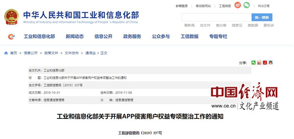 經(jīng)濟(jì)日報(bào)-中國經(jīng)濟(jì)網(wǎng)北京11月26日訊 日前,工業(yè)和信息化部發(fā)布《關(guān)于開展APP侵害用戶權(quán)益專項(xiàng)整治工作》的通知,《通知》稱,鑒于當(dāng)前APP違規(guī)收集個(gè)人信息、過度索權(quán)、頻繁騷擾、侵害用戶權(quán)益等問題突出將開展專項(xiàng)整治工作,專項(xiàng)整治工作時(shí)間將一直持續(xù)至2019年12月20日。