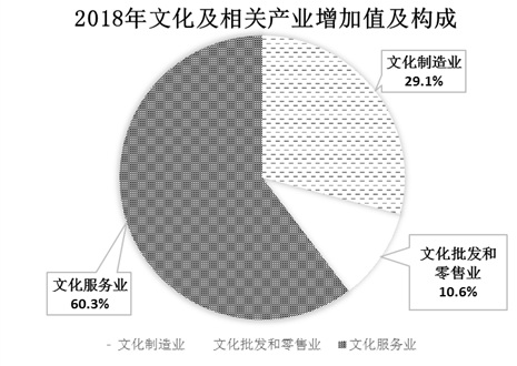 按行業(yè)大類分,2018年文化制造業(yè)增加值為11999億元,占文化及相關產(chǎn)業(yè)增加值的比重為29.1%;文化批發(fā)和零售業(yè)增加值為4340億元,占比為10.6%;文化服務業(yè)增加值為24832億元,占比為60.3%。