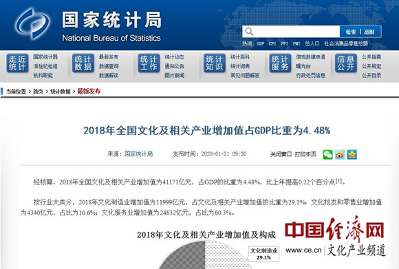 經(jīng)濟日報-中國經(jīng)濟網(wǎng)北京1月21日訊 1月21日,國家統(tǒng)計局發(fā)布2018年全國文化及相關產(chǎn)業(yè)增加值相關數(shù)據(jù)。據(jù)經(jīng)濟日報-中國經(jīng)濟網(wǎng)文化產(chǎn)業(yè)頻道(微信號:cewenhua)了解,經(jīng)核算,2018年全國文化及相關產(chǎn)業(yè)增加值為41171億元,占GDP的比重為4.48%,比上年提高0.22個百分點。>>>更多政策可查看中國經(jīng)濟網(wǎng)“中國文化產(chǎn)業(yè)政策庫”
