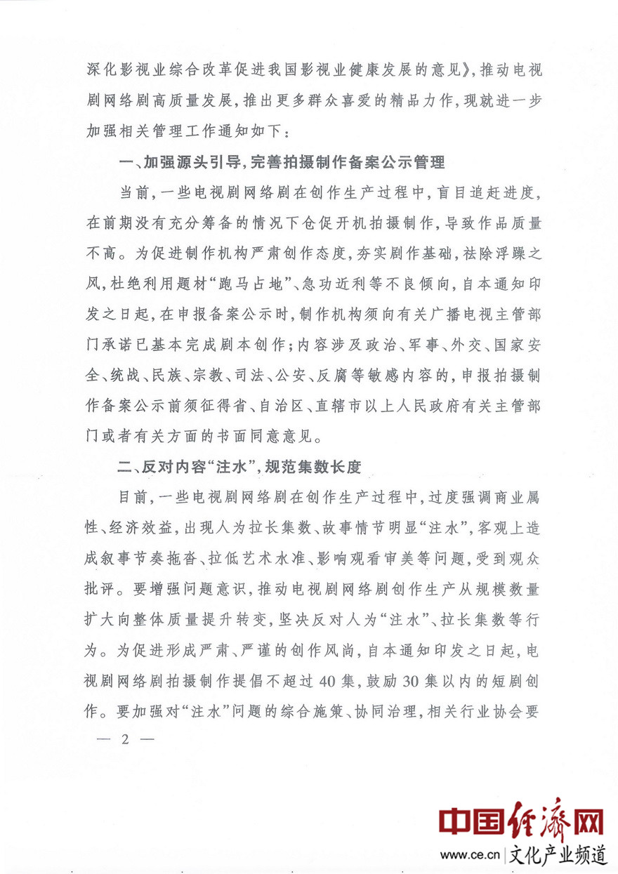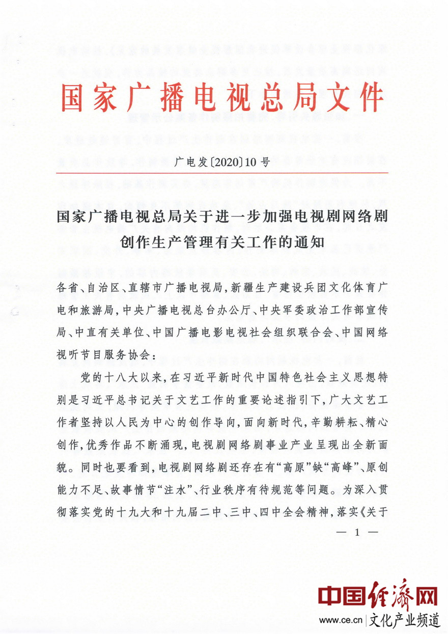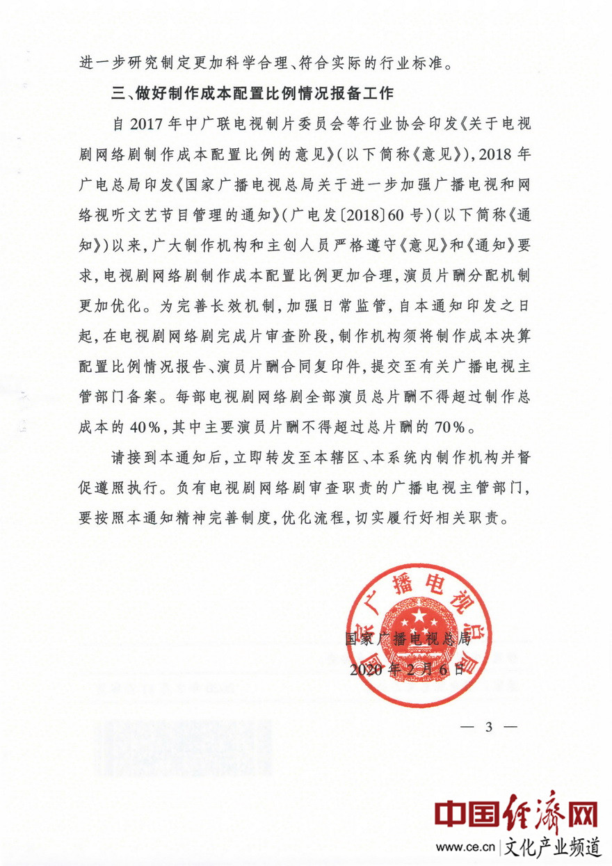 經濟日報-中國經濟網北京2月20日訊 近日,國家廣播電視總局下發了《進一步加強電視劇網絡劇創作生產管理有關工作的通知》(廣電發﹝2020﹞10號)。據經濟日報-中國經濟網文化產業頻道(微信號:cewenhua)了解,該《通知》要求:一是加強源頭引導,在申報備案公示時,制作機構須向省局承諾已基本完成劇本創作;二是反對內容“注水”,電視劇網絡劇拍攝制作提倡不超過40集,鼓勵30集以內短劇創作;三是做好制作成本配置比例情況報備工作。在電視劇網絡劇完成片審查階段,制作機構須將制作成本決算配置比例情況報告、演員片酬合同復印件,提交至省局備案。每部電視劇網絡劇全部演員總片酬不得超過制作總成本的40%,其中主要演員片酬不得超過總片酬的70%。>>>更多政策可查看中國經濟網“中國文化產業政策庫”