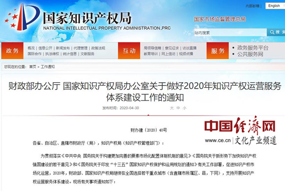 財政部辦公廳 國家知識產權局辦公室關于做好2020年知識產權運營服務體系建設工作的通知