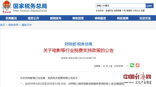 經(jīng)濟日報-中國經(jīng)濟網(wǎng)北京5月20日訊 近日,國家稅務總局官網(wǎng)發(fā)布《關于電影等行業(yè)稅費支持政策的公告》(以下簡稱《公告》),支持電影等行業(yè)發(fā)展。