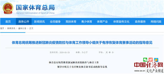 經(jīng)濟日報-中國經(jīng)濟網(wǎng)北京6月3日訊 近日,國家體育總局發(fā)布了《體育總局統(tǒng)籌推進新冠肺炎疫情防控與體育工作領導小組關于有序恢復體育賽事活動的指導意見》(以下簡稱“意見”),意見指出,采取預約、限流等方式,有序開放各類運動場所。 >>>更多政策可查看中國經(jīng)濟網(wǎng)“中國文化產(chǎn)業(yè)政策庫”
