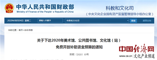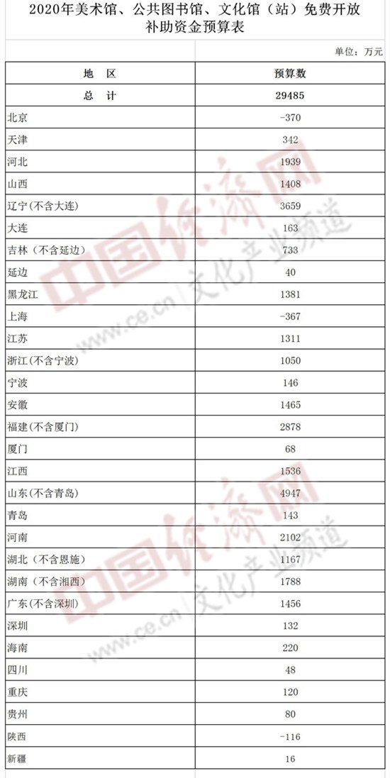 經(jīng)濟(jì)日?qǐng)?bào)-中國(guó)經(jīng)濟(jì)網(wǎng)北京8月4日訊 8月4日,財(cái)政部官網(wǎng)發(fā)布了《關(guān)于下達(dá)2020年美術(shù)館、公共圖書館、文化館(站)免費(fèi)開放補(bǔ)助資金預(yù)算的通知》(以下簡(jiǎn)稱“通知”),據(jù)通知附件《2020年美術(shù)館、公共圖書館、文化館(站)免費(fèi)開放補(bǔ)助資金預(yù)算表》顯示,2020年美術(shù)館、公共圖書館、文化館(站)免費(fèi)開放補(bǔ)助資金預(yù)算為2.9485億。