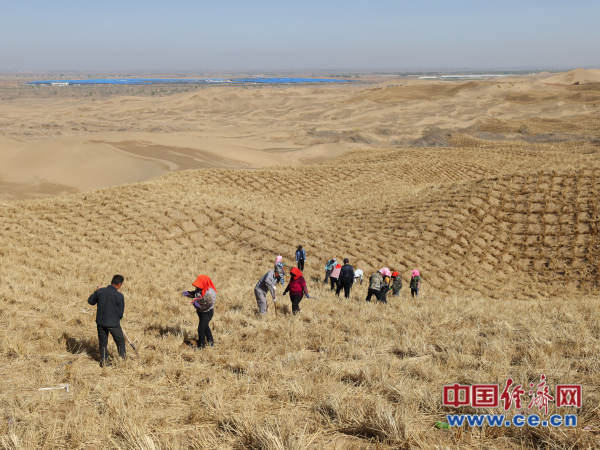 在寧夏石嘴山市平羅縣陶樂鎮,趕著剛下的雨水帶來的墑情,來自四鄰八鄉的數十位村民正在流動沙丘上緊鑼密鼓地治沙作業。自4月13日開工至今,修建生產道路、扎設草方格、栽植檸條、鋪設移動式滴灌等一系列工作在這里有序推進。