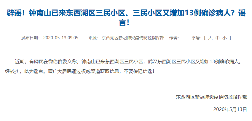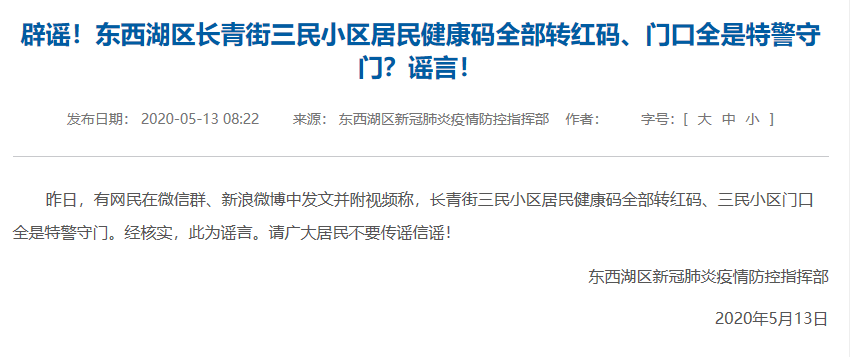 據武漢市東西湖區人民政府官網5月13日消息,經核實,網傳“鐘南山已來東西湖區三民小區,武漢東西湖區三民小區又增加13例確診病人。” “長青街三民小區居民健康碼全部轉紅碼、三民小區門口全是特警守門”均系謠言。