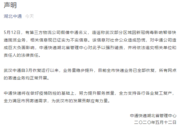 5月12日,湖北中通吉物流有限公司官微“湖北中通”發布聲明稱,5月12日,有第三方物流公司假借中通名義,造謠稱武漢部分區域因新冠病毒影響暫停快遞攬派業務,相關信息現已證實為不實信息。武漢中通自3月恢復運行以來,業務量穩步提升,目前全市快遞業務已全部恢復,所有網點的寄遞業務均正常開展。