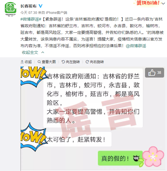 謠言粉碎機三:“吉林省政府通知”:吉林多市屬高風險區?假的!