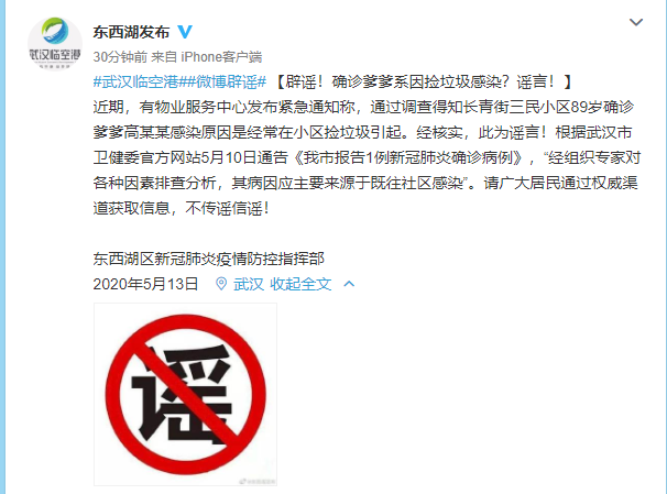 據武漢市東西湖區人民政府官方微博5月13日消息,近期,有物業服務中心發布緊急通知稱,通過調查得知武漢市東西湖區長青街三民小區89歲確診爹爹高某某感染原因是經常在小區撿垃圾引起。經核實,此為謠言。根據武漢市衛健委官方網站5月10日通告《我市報告1例新冠肺炎確診病例》,“經組織專家對各種因素排查分析,其病因應主要來源于既往社區感染”。請廣大居民通過權威渠道獲取信息,不傳謠信謠!