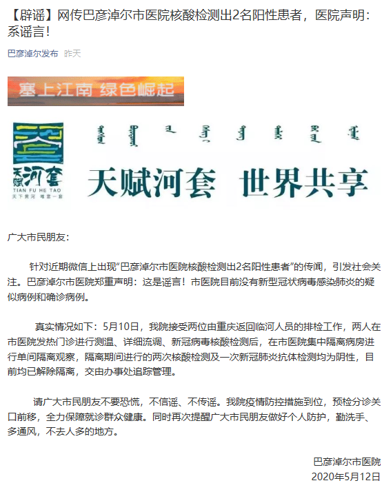 據巴彥淖爾市互聯網信息辦公室官微5月12日消息,針對近期微信上出現“巴彥淖爾市醫院核酸檢測出2名陽性患者”的傳聞,巴彥淖爾市醫院鄭重聲明:這是謠言,巴彥淖爾市醫院目前沒有新型冠狀病毒感染肺炎的疑似病例和確診病例。
