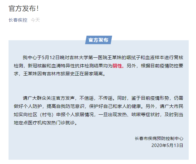 近日,有網傳稱吉林大學第一醫院出現新冠病例。5月13日,長春市疾病預防控制中心官微對此回應稱,長春市疾病預防控制中心于5月12日晚對吉林大學第一醫院王某姝的咽拭子和血液樣本進行復核檢測,新冠核酸和血清特異性抗體檢測結果均為陰性。另外,根據目前疫情防控要求,王某姝因有吉林市旅居史正在居家隔離。請廣大群眾關注官方發聲,不信謠,不傳謠。