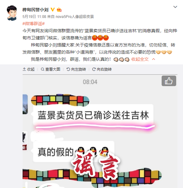 據吉林省樺甸市公安局永吉派出所民警劉剛 @樺甸民警小劉 5月19日消息,經向樺甸市衛健部門核實,網傳“藍景賣貨員已確診送往吉林”系謠言。