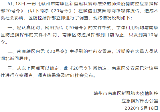 據(jù)中共贛州市南康區(qū)委宣傳部官微“南康發(fā)布”5月19日消息,贛州市南康區(qū)新冠肺炎疫情防控應(yīng)急指揮部辦公室稱(chēng),5月18日,一份《贛州市南康區(qū)新型冠狀病毒感染的肺炎疫情防控應(yīng)急指揮部20號(hào)令》(以下簡(jiǎn)稱(chēng)《20號(hào)令》)在微信朋友圈等網(wǎng)絡(luò)媒體流傳,造成不良社會(huì)影響,南康區(qū)防控指揮部立即進(jìn)行了調(diào)查。現(xiàn)將情況說(shuō)明如下: