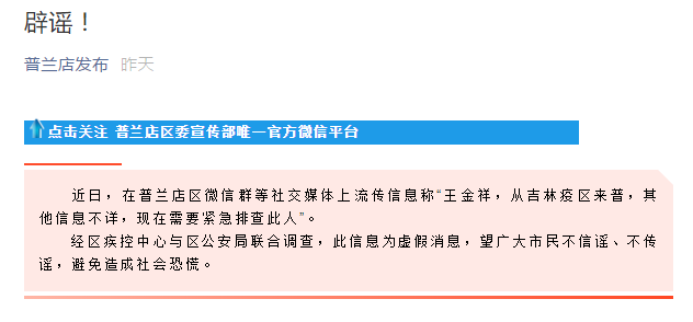據(jù)中共大連市普蘭店區(qū)委宣傳部“普蘭店發(fā)布”5月21日消息,經(jīng)普蘭店區(qū)疾控中心與公安局聯(lián)合調(diào)查,網(wǎng)傳 “王金祥,從吉林疫區(qū)來(lái)普(大連市普蘭店區(qū)),其他信息不詳,現(xiàn)在需要緊急排查此人……”為虛假消息,望廣大市民不信謠、不傳謠。