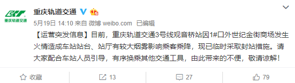 近日,有消息稱(chēng)因出現(xiàn)疑似病例,重慶軌道交通3號(hào)線(xiàn)觀音橋站被封。對(duì)此,5月19日14時(shí),重慶市軌道交通(集團(tuán))有限公司@重慶軌道交通回應(yīng)稱(chēng),目前,重慶軌道交通3號(hào)線(xiàn)觀音橋站因1#口外世紀(jì)金街商場(chǎng)發(fā)生火情造成車(chē)站站臺(tái)、站廳有較大煙霧影響乘客乘降,現(xiàn)已臨時(shí)采取封站措施。????