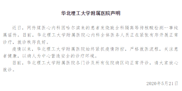 5月21日,華北理工大學(xué)附屬醫(yī)院發(fā)布聲明稱(chēng),近日,網(wǎng)傳“煤醫(yī)(現(xiàn)為華北理工大學(xué)附屬醫(yī)院)心內(nèi)科因哈爾濱來(lái)的患者發(fā)燒致全科隔離等待核酸檢測(cè)”一事純屬謠傳。目前,華北理工大學(xué)附屬醫(yī)院心內(nèi)科全體醫(yī)務(wù)人員正在緊張有序開(kāi)展正常診療,就診秩序良好。