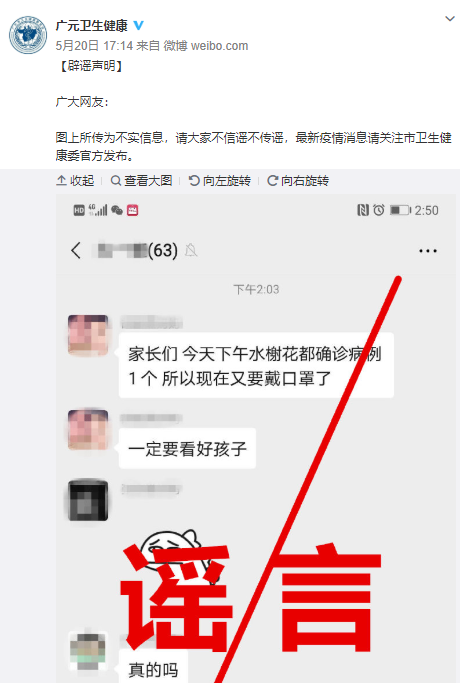 5月20日,四川省廣元市衛(wèi)生健康委員會(huì)官方微博@廣元衛(wèi)生健康發(fā)布辟謠聲明稱(chēng),網(wǎng)傳“廣元市水榭花都小區(qū)確診一新冠肺炎病例”為謠言。