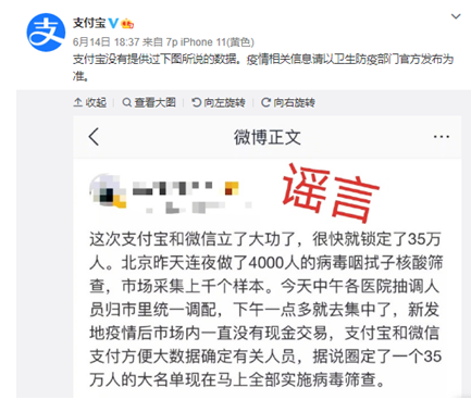 6月14日18時許,@支付寶對此回應稱,支付寶沒有提供過下圖所說的數據,疫情相關信息請以衛生防疫部門官方發布為準。隨后,@騰訊微信團隊 也發布辟謠消息稱,微信并未提供過下圖提的數據,請大家認準衛生防疫部門官方信息發布渠道,勿信謠傳謠。