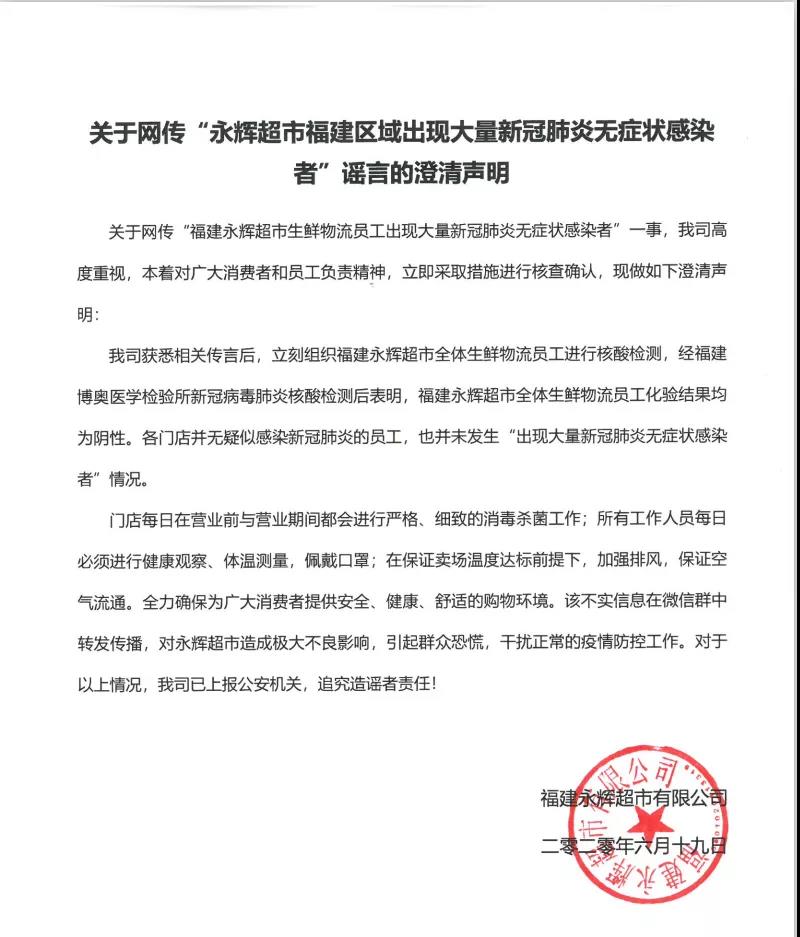 經濟日報-中國經濟網6月23日訊(記者朱國旺 郭文培) 6月19日,就“福建永輝超市生鮮物流員工出現大量新冠肺炎無癥狀感染者”一事,福建永輝超市有限公司聲明稱,獲悉相關傳言后,立刻組織福建永輝超市全體生鮮物流員工進行核酸檢測,福建永輝超市全體生鮮物流員工化驗結果均為陰性。各門店并無疑似感染新冠肺炎的員工,也并未發生“出現大量新冠肺炎無癥狀感染者”情況。