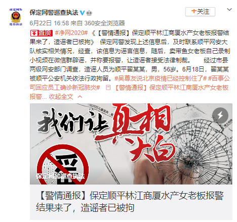 6月22日,保定市公安局網絡安全保衛支隊發布警情通報稱,網傳“河北省保定市順平縣一帶魚老板店去北京新發地進魚被隔離”等信息為謠言。經過市縣兩級網安部門調查,造謠人翟某某已被順平公安機關依法行政拘留。