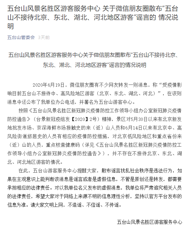 6月20日,五臺山風景名勝區游客服務中心辟謠稱,“五臺山不接待北京、東北、湖北、河北地區游客”的說法為謠言。