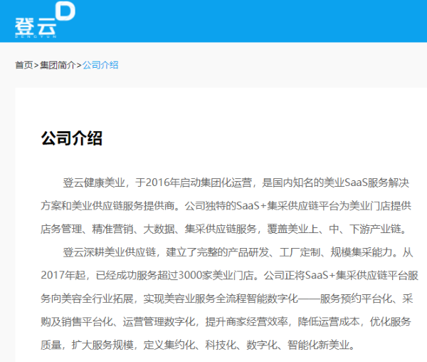 資料顯示,可顏麗爾和可諾丹婷同屬的登云集團全稱江西登云健康美業互聯有限公司,成立于2014年12月。登云集團于2016年啟動集團化運營,從2017年起,已經服務超過3000家美業門店。
