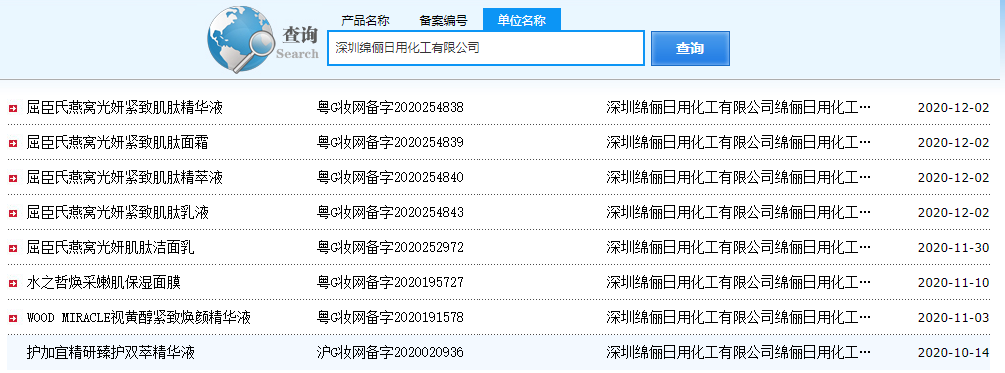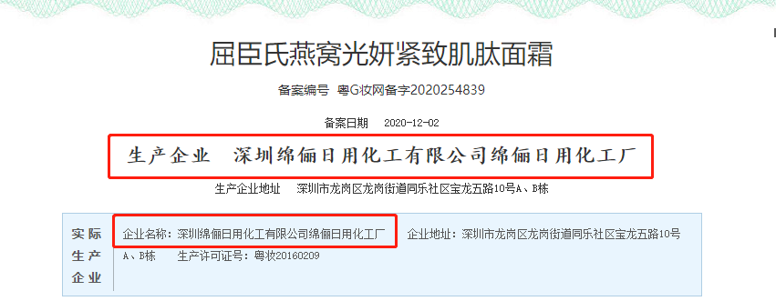 記者通過國產(chǎn)非特殊用途化妝品備案平臺查詢得知,深圳綿儷日用化工有限公司是屈臣氏燕窩光妍緊致肌肽精華液、歐薇蔻肌肽水光晶致面膜、護(hù)加宜精研臻護(hù)雙萃精華液等800多款產(chǎn)品的生產(chǎn)企業(yè)。