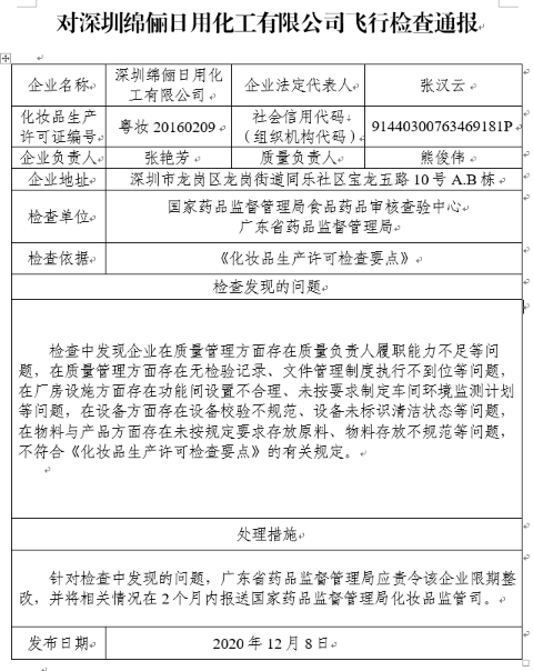 針對檢查中發(fā)現(xiàn)的問題,國家藥監(jiān)局要求廣東省藥品監(jiān)督管理局應(yīng)責(zé)令深圳綿儷日用化工有限公司限期整改,并將相關(guān)情況在2個月內(nèi)報送國家藥品監(jiān)督管理局化妝品監(jiān)管司。
