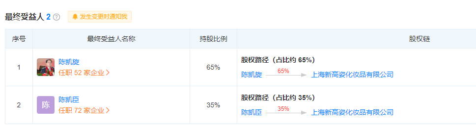 記者查詢資料顯示,上海新高姿化妝品有限公司共生產(chǎn)了800多款國(guó)產(chǎn)非特殊用途化妝品,其中包括高姿、赫拉、芊嘉、安妍雅等多個(gè)知名化妝品品牌。公司共有九個(gè)子公司,最終受益人為陳凱旋,持股占比65%。