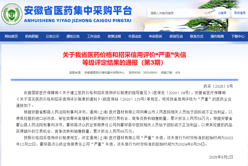 通報顯示,根據安徽省黟縣人民法院刑事判決書,通用(上海)醫療器材有限公司向黃山市人民醫院相關人員給予回扣或不正當利益,以使其經營的進口創傷類、脊柱類骨科高值耗材獲得額外的交易機會、競爭優勢和銷售數量,累計折合人民幣54萬元;按照價格招采信用評價制度規定,評定通用(上海)醫療器材有限公司“嚴重”失信,該失信行為時效標準的起始時間為2023年12月22日。