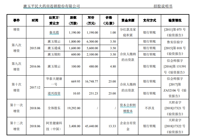 “V觀財報”查閱漱玉平民招股書發現,2018年6月,漱玉平民股東大會通過決議,同意將注冊資本增加至36480萬元。新增的注冊資本3408萬元由阿里健康以45440萬元認繳,全部為貨幣出資。本次增資的價格為13.33元/股。