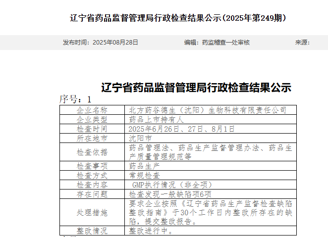 中國經(jīng)濟網(wǎng)9月1日訊 日前,遼寧省藥品監(jiān)督管理局公示多則行政檢查結(jié)果信息。其中,在對北方藥谷德生(沈陽)生物科技有限責任公司GMP執(zhí)行情況檢查中,發(fā)現(xiàn)該公司存在一般缺陷項6項。對此,遼寧省藥品監(jiān)督管理局要求該公司按照《遼寧省藥品生產(chǎn)監(jiān)督檢查缺陷整改指南》于30個工作日內(nèi)整改所存在的缺陷,提交整改報告。目前,該公司整改進行中。