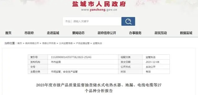 2023年度鹽城市市場監(jiān)督管理局委托江蘇威諾檢測技術(shù)有限公司組織實施儲水式電熱水器產(chǎn)品市級監(jiān)督抽查。本次抽查計劃5批次,抽到5批次,經(jīng)檢驗合格5批次。
