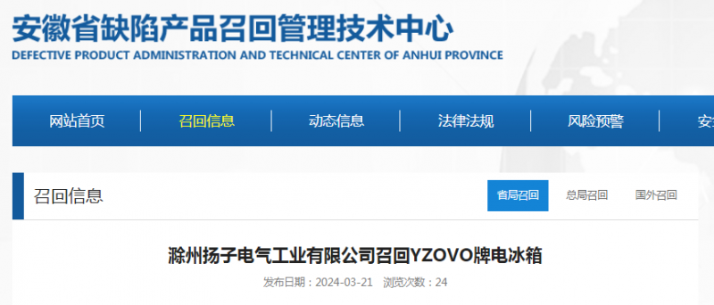 日前,滁州揚子電氣工業有限公司按照《消費品召回管理暫行規定》的要求,向安徽省市場監督管理局、滁州市市場監督管理局報告了召回計劃,將自即日起,召回2023年8月21日至2023年10月7日期間生產的YZOVO牌電冰箱(BCD-72P148),涉及數量為50臺。
