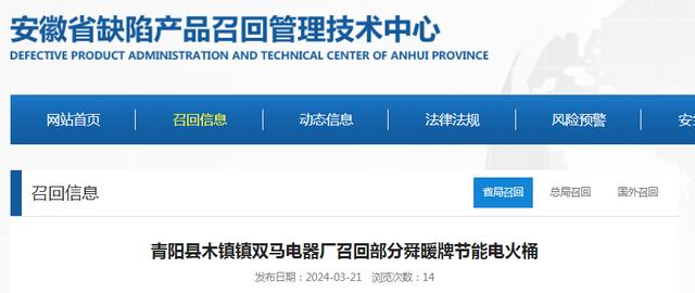 日前,青陽縣木鎮鎮雙馬電器廠按照《消費品召回管理暫行規定》的要求,向池州市市場監管局、安徽省市場監督管理局報告了召回計劃,將自即日起,召回2023年9月生產的舜暖牌400W型節能電火桶,涉及數量為50件。