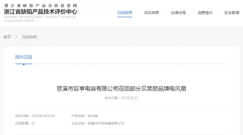 日前,慈溪市巨亨電器有限公司按照《消費品召回管理暫行規定》的要求,主動向浙江省市場監督管理局和寧波市市場監督管理局報告了召回計劃,將自即日起,召回2023年5月15日至2023年6月10日期間制造的部分貝芙麗牌B280型號電風扇,涉及數量為37臺。