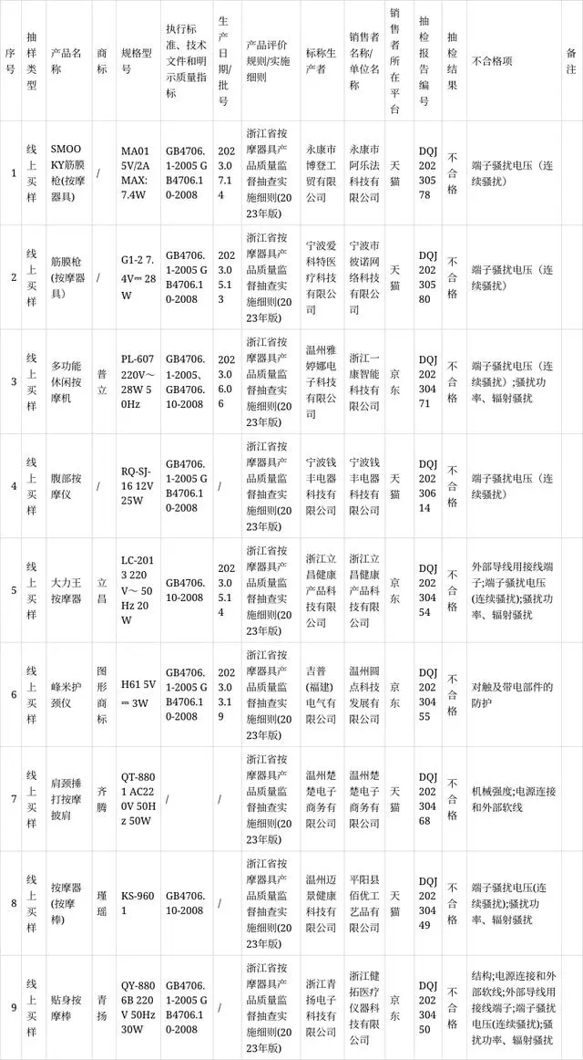 本次抽查了43批次按摩器具產(chǎn)品,其中9批次產(chǎn)品不合格。不合格項目為對觸及帶電部件的防護、機械強度、結(jié)構(gòu)、電源連接和外部軟線、外部導(dǎo)線用接線端子、端子騷擾電壓(連續(xù)騷擾)、騷擾功率、輻射騷擾。