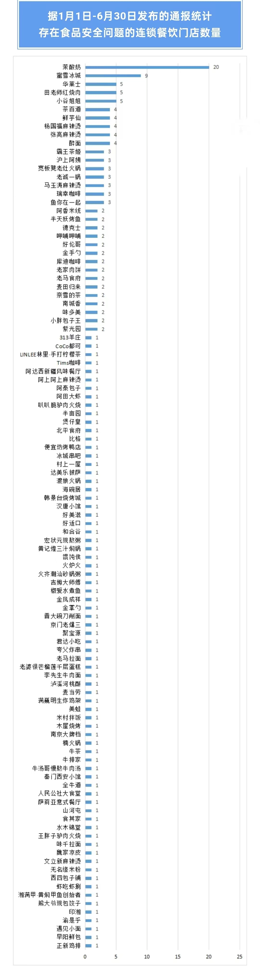 7月3日,北京市消費者協(xié)會公布今年1月1日至6月30日北京市市場監(jiān)管系統(tǒng)食品安全大檢查結(jié)果。結(jié)果顯示,茉酸奶有20家門店存在食品安全問題,蜜雪冰城有9家門店存在食品安全問題,華萊士、田老師紅燒肉、小谷姐姐、茶百道、鮮芋仙、楊國福麻辣燙、張亮麻辣燙、醉面等發(fā)現(xiàn)存在食品安全問題的門店數(shù)量分列3到10位。