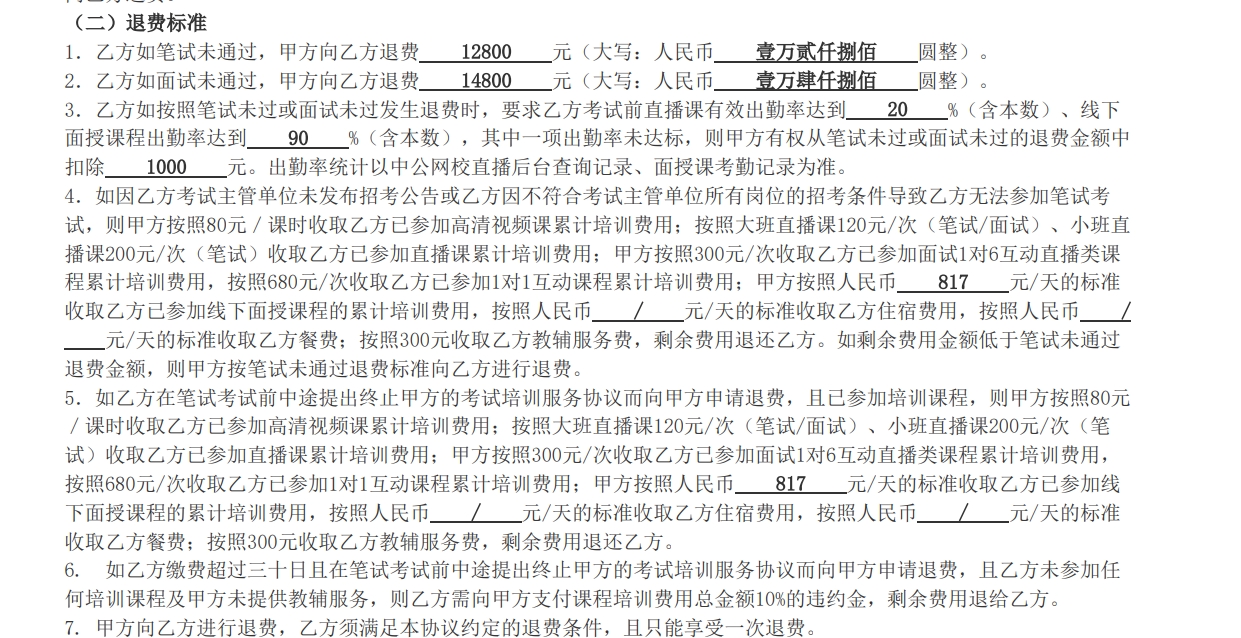 記者在武女士提供的其與中公教育簽訂的協議書里看到,符合出勤率等其他條件后,如果筆試或面試未通過,中公教育將為學員全額退款。學員需在規定時間內提交相關材料申請退費,中公教育核實所提交材料真實、符合退費條件后,在30至45個工作日內將約定的退費金額支付至學員提供的銀行賬戶。