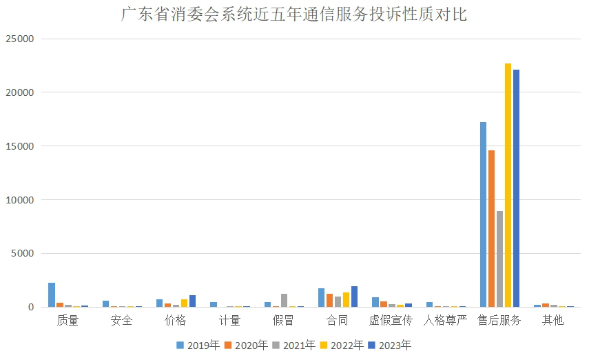 從投訴類別來看,近5年通信服務(wù)投訴95%以上集中在移動(dòng)電話服務(wù),與當(dāng)前通信業(yè)發(fā)展現(xiàn)狀相符(2023年廣東固話、移動(dòng)電話用戶數(shù)比例約為1:10)。從投訴性質(zhì)來看,消費(fèi)者反映的問題主要集中在售后服務(wù)、合同和價(jià)格3類,其中售后服務(wù)問題最為集中,占投訴總量的80.19%,是通信服務(wù)類投訴增長(zhǎng)變化的主要因素。從地區(qū)分布來看,通信服務(wù)投訴集中在消費(fèi)活躍的珠三角地區(qū),主要與經(jīng)濟(jì)發(fā)展?fàn)顩r、人員密集程度相關(guān)。