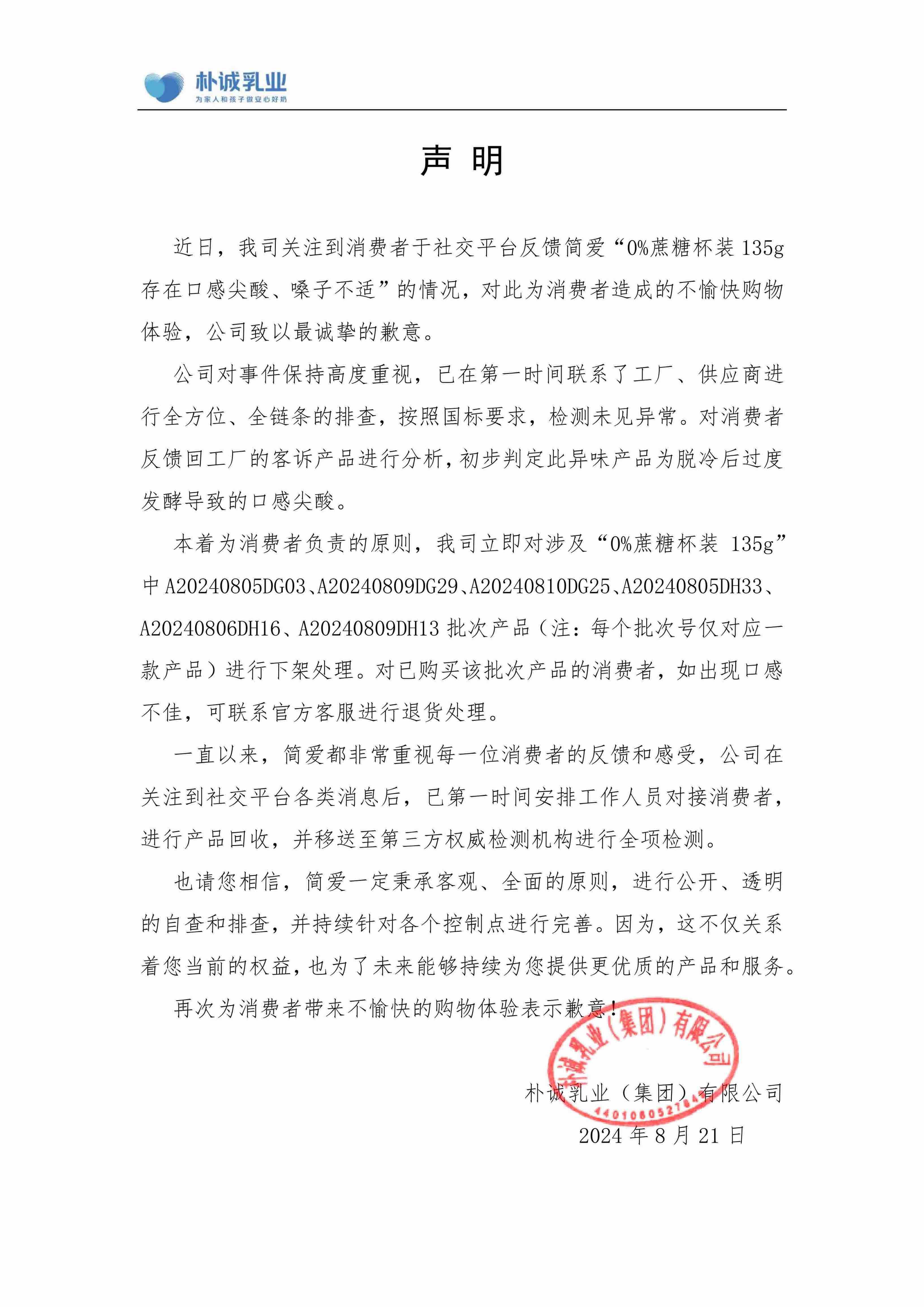 其在向記者發(fā)送的官方聲明中稱,公司已在第一時間聯(lián)系了工廠、供應(yīng)商進行全方位、全鏈條的排查,按照國標(biāo)要求,檢測未見異常。對消費者反饋回工廠的客訴產(chǎn)品進行分析,初步判定此異味產(chǎn)品為脫冷后過度發(fā)酵導(dǎo)致的口感尖酸。本著為消費者負(fù)責(zé)的原則,該司立即對涉及“0%蔗糖杯裝135g”中A20240805DG03、A20240809DG29、A20240810DG25、A20240805DH33、A20240806DH16、A20240809DH13批次產(chǎn)品進行下架處理。對已購買該批次產(chǎn)品的消費者,如出現(xiàn)口感不佳,可聯(lián)系官方客服進行退貨處理。