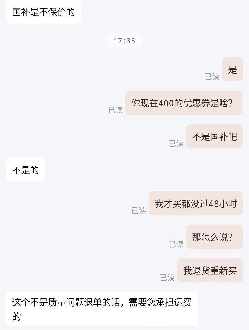 面對這突如其來的降價,李先生深感憤怒與無奈。他嘗試通過平臺客服協(xié)調(diào)退還差價,但得到的答復(fù)卻是:由于產(chǎn)品享受了政府補貼,差價不予退還。李先生氣憤地表示:“有種被當(dāng)傻子耍的感覺。”經(jīng)過多次溝通,李先生最終與客服協(xié)商達成了無條件退貨的協(xié)議,退貨運費由平臺承擔(dān)。隨后,李先生又用家人的賬號領(lǐng)取政府補貼后,加上新的活動優(yōu)惠,以低于原購買價500元的價格于同一網(wǎng)購平臺再次購買了同一款空氣凈化器。